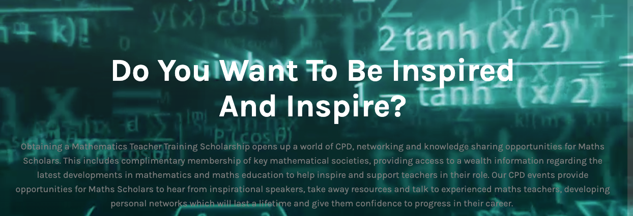 You can gain an insight into the life of a Maths Scholar and trainee maths teacher by taking a look at the Scholars Blogs section on our website, where Scholars past and present share their experiences of teacher training, how they have benefitted from the Maths Scholarship and what out CPD events have covered.